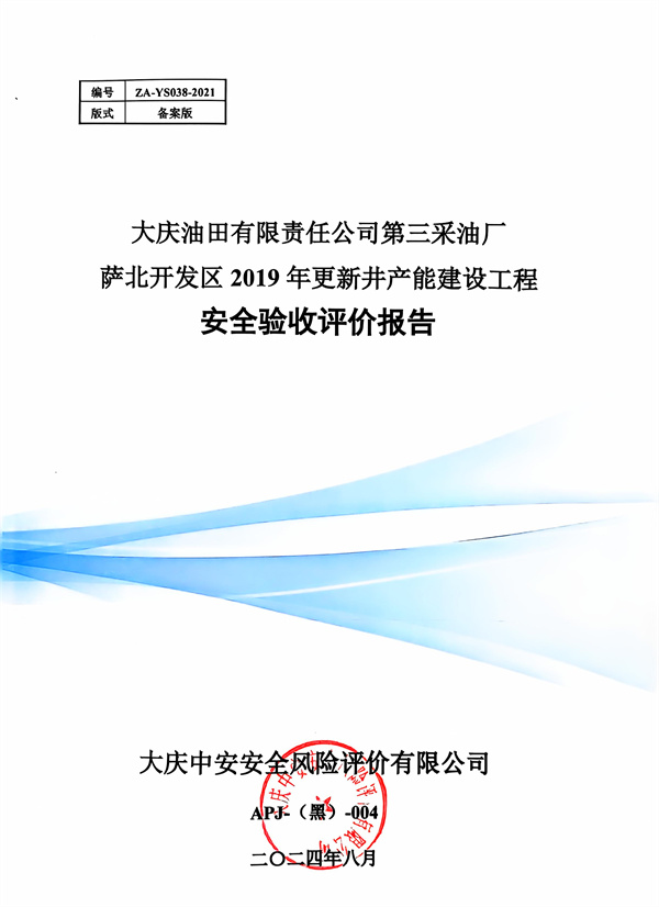 大慶油田有限責任公司第三采油廠薩北開發(fā)區(qū)2019年更新井產(chǎn)能建設(shè)工程安全驗收評價報告