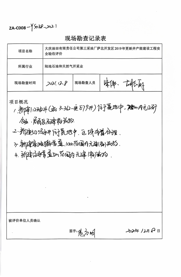 大慶油田有限責任公司第三采油廠薩北開發(fā)區(qū)2019年更新井產(chǎn)能建設(shè)工程安全驗收評價報告 |