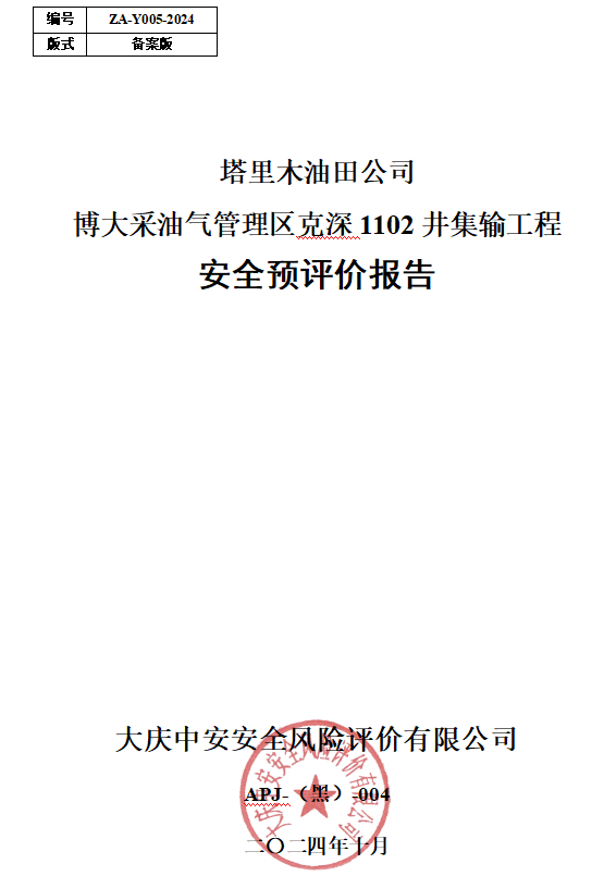 塔里木油田公司博大采油氣管理區(qū)克深1102井集輸工程安全預(yù)評價報(bào)告