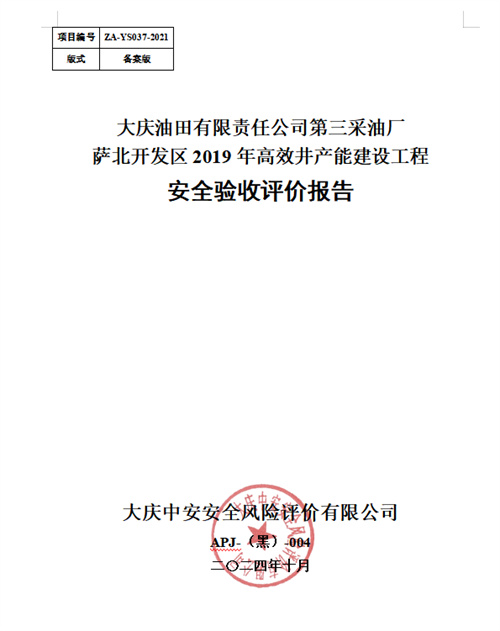 大慶油田有限責任公司第三采油廠薩北開發(fā)區(qū)2019年高效井產(chǎn)能建設工程安全驗收評價報告