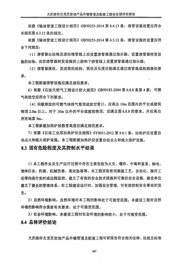大慶油田古龍頁巖油產品外輸管道及配套工程可研報告符合相關法律、法規(guī)及標準規(guī)范對安全生產的要求。建設單位應在其今后的設計、施工和運行中進一步落實本工程可研報告提出的安全技術措施和本次預評價提出的補充安全措施,確實保證工程安全設施和主體工程的“三同時”,并在工程竣工投產后切實加強安全生產管理,以實現(xiàn)工程安全、平穩(wěn)運行,建成投產后可以達到安全生產的目的。 |