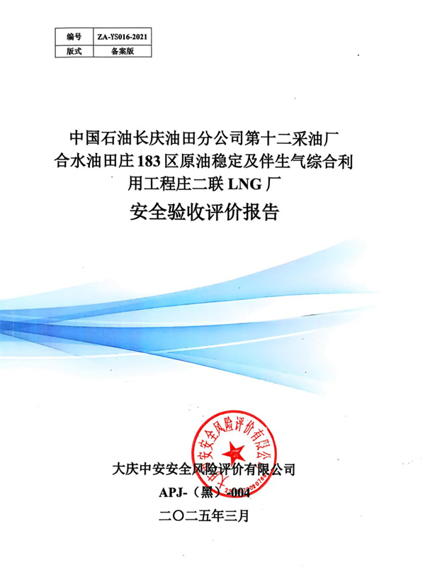 中國(guó)石油長(zhǎng)慶油田分公司第十二采油廠合水油田莊183區(qū)原油穩(wěn)定及伴生氣綜合利用工程莊二聯(lián)LNG廠安全驗(yàn)收評(píng)價(jià)報(bào)告 |