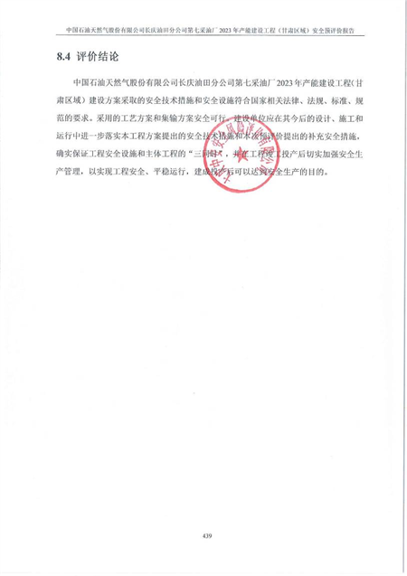 中國石油天然氣股份有限公司長慶油田分公司第七采油廠2023年產(chǎn)能建設(shè)工程(甘肅區(qū)域)建設(shè)方案采取的安全技術(shù)措施和安全設(shè)施符合國家相關(guān)法律、法規(guī)、標(biāo)準(zhǔn)、規(guī)范的要求。采用的工藝方案和集輸方案安全可行。建設(shè)單位應(yīng)在其今后的設(shè)計(jì)、施工和運(yùn)行中進(jìn)一步落實(shí)本工程方案提出的安全技術(shù)措施和本次預(yù)評價(jià)提出的補(bǔ)充安全措施,確實(shí)保證工程安全設(shè)施和主體工程的“三同時”,并在工程竣工投產(chǎn)后切實(shí)加強(qiáng)安全生產(chǎn)管理,以實(shí)現(xiàn)工程安全、平穩(wěn)運(yùn)行,建成投產(chǎn)后可以達(dá)到安全生產(chǎn)的目的。 |