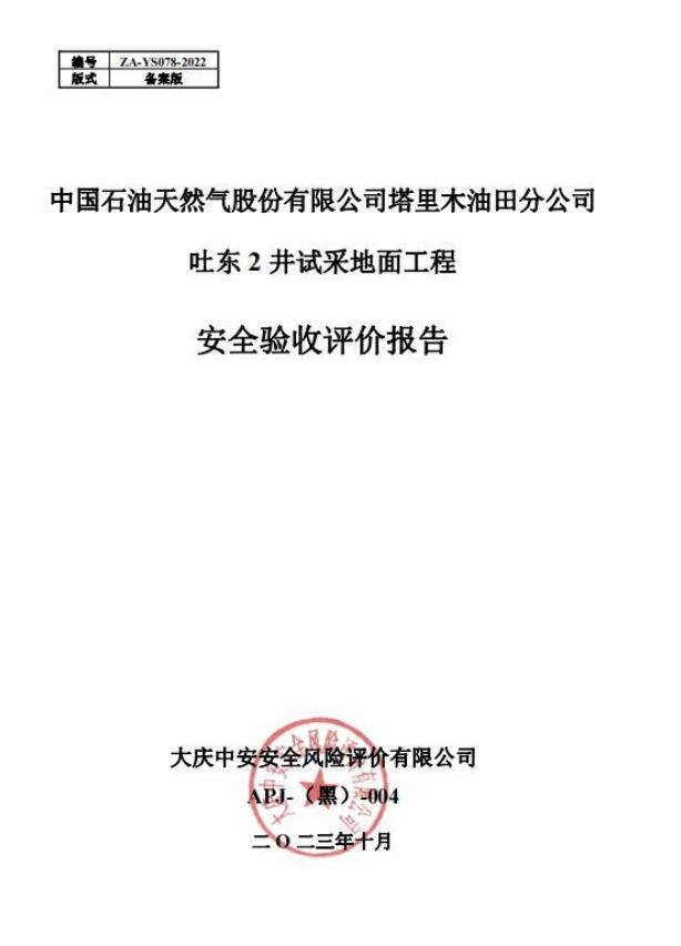 中國(guó)石油天然氣股份有限公司塔里木油田分公司吐東2井試采地面工程安全驗(yàn)收評(píng)價(jià)