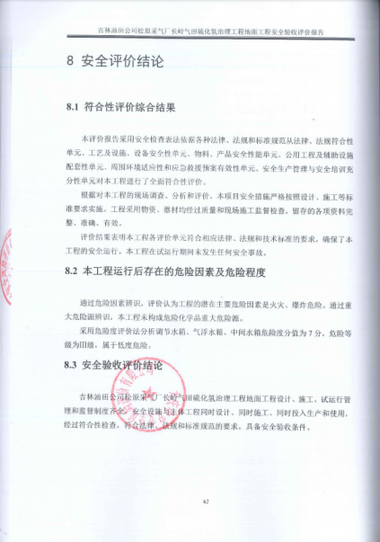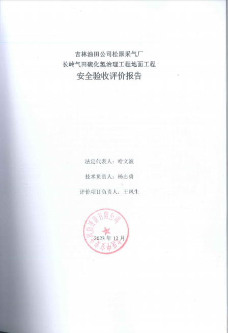吉林油田公司松原采氣廠長(zhǎng)嶺氣田硫化氫治理工程地面工程安全驗(yàn)收評(píng)價(jià)報(bào)告