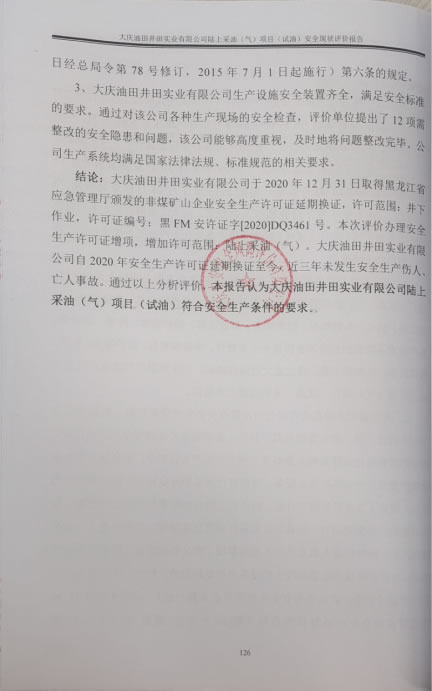 大慶油田井田實(shí)業(yè)有限公司于2020年12月31日取得黑龍江省應(yīng)急管理廳頒發(fā)的非煤礦山企業(yè)安全生產(chǎn)許可證延期換證,許可范圍:井下作業(yè),許可證編號(hào):黑FM安許證字[2020]DQ3461號(hào)。本次評(píng)價(jià)辦理安全生產(chǎn)許可證增項(xiàng),增加許可范圍:陸上采油(氣)。大慶油田井田實(shí)業(yè)有限公司自2020年安全生產(chǎn)許可證延期換證至今,近三年未發(fā)生安全生產(chǎn)傷人、亡人事故。通過(guò)以上分析評(píng)價(jià),本報(bào)告認(rèn)為大慶油田井田實(shí)業(yè)有限公司陸上采油(氣)項(xiàng)目(試油)符合安全生產(chǎn)條件的要求。 |