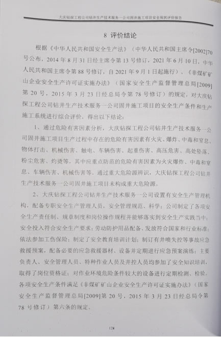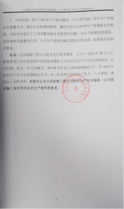 大慶鉆探工程公司鉆井生產(chǎn)技術(shù)服務(wù)一公司于2020年09月1日取得黑龍江省應(yīng)急管理廳頒發(fā)的非煤礦山企業(yè)安全生產(chǎn)許可證延期換證,許可范圍:鉆井,許可證編號(hào):黑FM安許證字[2020]DQ0022號(hào)。自2020年安全生產(chǎn)許可證延期換證至今,近三年未發(fā)生安全生產(chǎn)傷人、亡人事故。通過以上分析評(píng)價(jià),本報(bào)告認(rèn)為大慶鉆探工程公司鉆井生產(chǎn)技術(shù)服務(wù)一公司固井施工項(xiàng)目符合安全生產(chǎn)條件的要求。 |