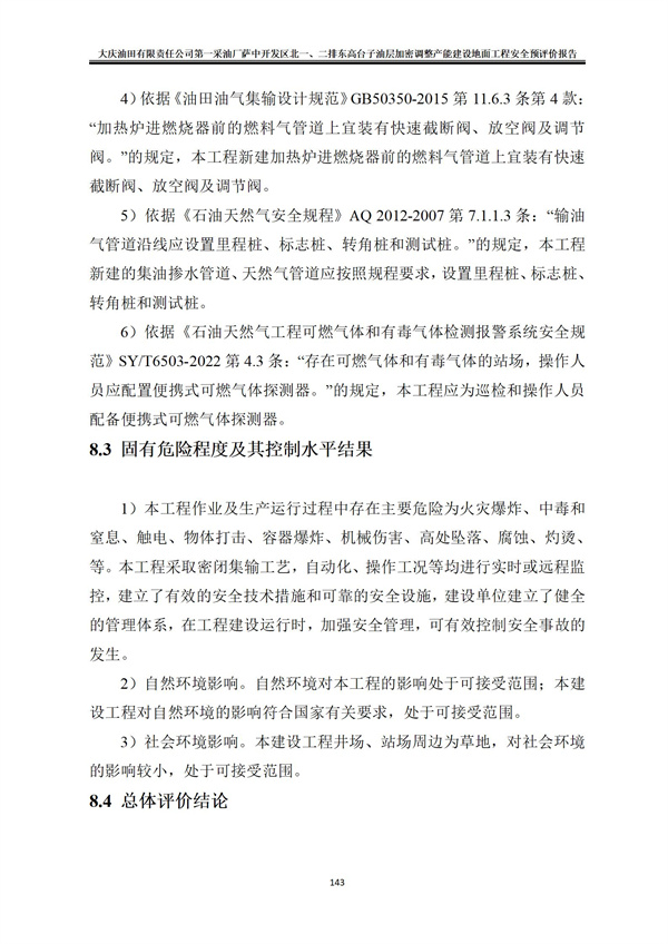 大慶油田有限責任公司第一采油廠薩中開發(fā)區(qū)北一、二排東高臺子油層加密調(diào)整產(chǎn)能建設地面工程方案符合相關法律、法規(guī)及標準規(guī)范對安全生產(chǎn)的要求。建設單位應在其今后的設計、施工和運行中進一步落實本工程方案提出的安全技術措施和本次安全預評價提出的補充安全措施,確實保證工程安全設施和主體工程的“三同時”,并在工程竣工投產(chǎn)后切實加強安全生產(chǎn)管理,以實現(xiàn)工程安全、平穩(wěn)運行,建成投產(chǎn)后可以確保安全生產(chǎn)。 |