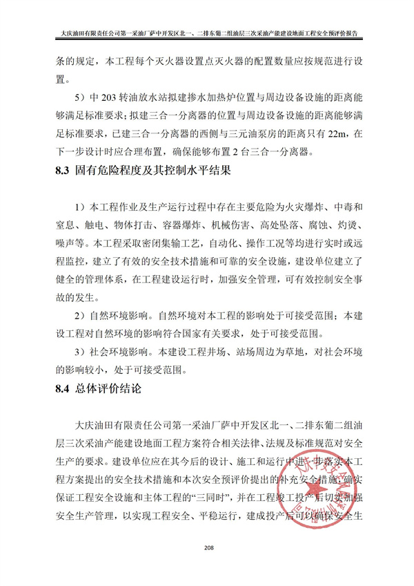 大慶油田有限責(zé)任公司第一采油廠薩中開發(fā)區(qū)北一、二排東葡二組油層三次采油產(chǎn)能建設(shè)地面工程方案符合相關(guān)法律、法規(guī)及標(biāo)準(zhǔn)規(guī)范對安全生產(chǎn)的要求。建設(shè)單位應(yīng)在其今后的設(shè)計(jì)、施工和運(yùn)行中進(jìn)一步落實(shí)本工程方案提出的安全技術(shù)措施和本次安全預(yù)評價(jià)提出的補(bǔ)充安全措施,確實(shí)保證工程安全設(shè)施和主體工程的“三同時(shí)”,并在工程竣工投產(chǎn)后切實(shí)加強(qiáng)安全生產(chǎn)管理,以實(shí)現(xiàn)工程安全、平穩(wěn)運(yùn)行,建成投產(chǎn)后可以確保安全生產(chǎn)。 |