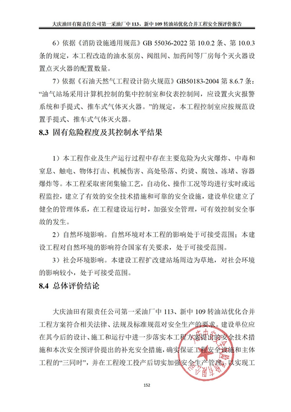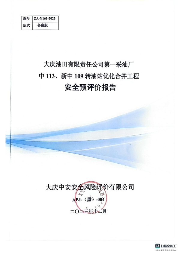 大慶油田有限責任公司第一采油廠中 113、新中 109 轉(zhuǎn)油站優(yōu)化合并工程安全預評價
