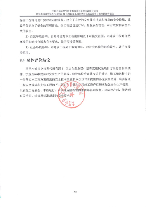 中國石油天然氣股份有限公司塔里木油田克拉蘇氣田克深31區(qū)塊白堊系巴什基奇克組試采項目安全預評價 |