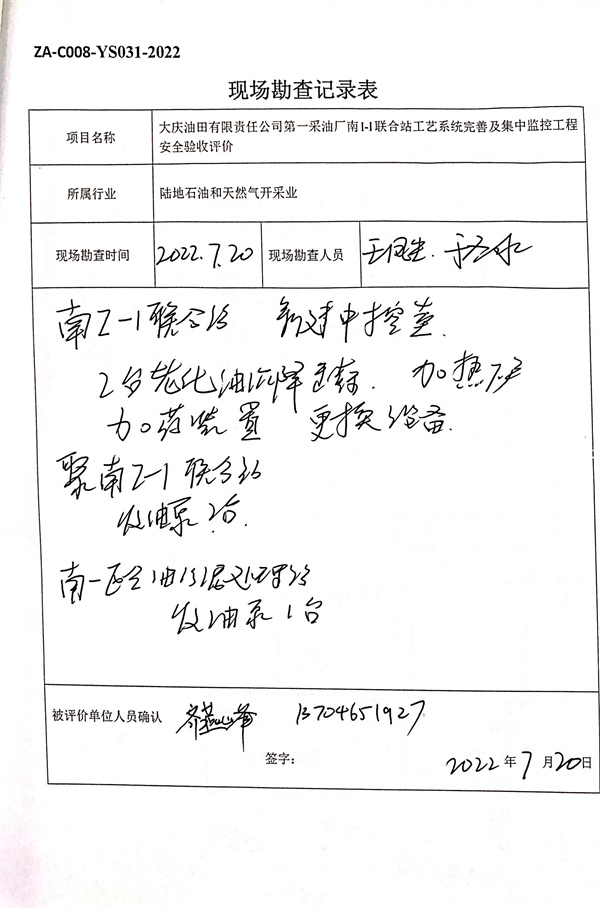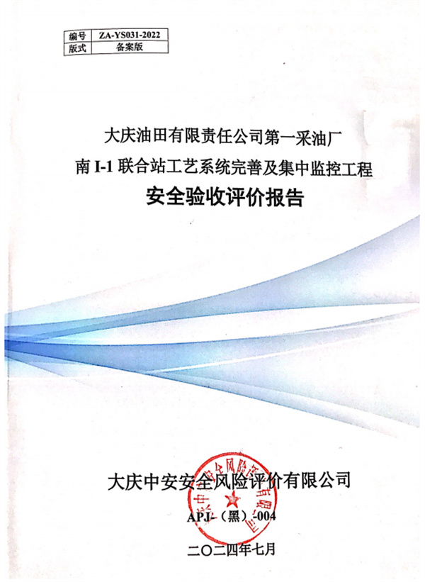 大慶油田有限責任公司第一采油廠南I-I聯(lián)合站工藝系統(tǒng)完善及集中監(jiān)控工程安全驗收評價報告 |