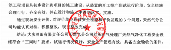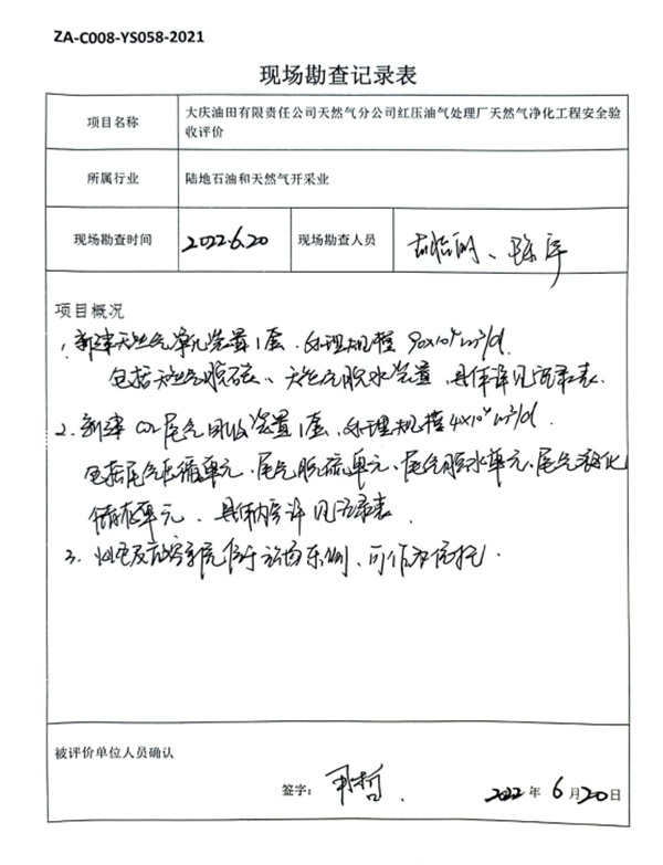 大慶油田有限責任公司天然氣分公司紅壓油氣處理廠天然氣凈化工程安全驗收評價報告 |